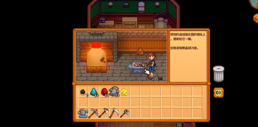 铁匠铺由克林特经营,主要提供三大核心功能:工具升级、矿石购买和晶球处理。玩家可在此消耗金属锭和金币逐步升级农耕工具,包括锄头、水壶、斧头和十字镐。店铺内常年出售煤炭及基础矿石,包括铜矿、铁矿和金矿,价格随市场波动但始终维持稳定供应。晶球开启服务每次收费25金,是获取稀有矿物和古物的重要途径。