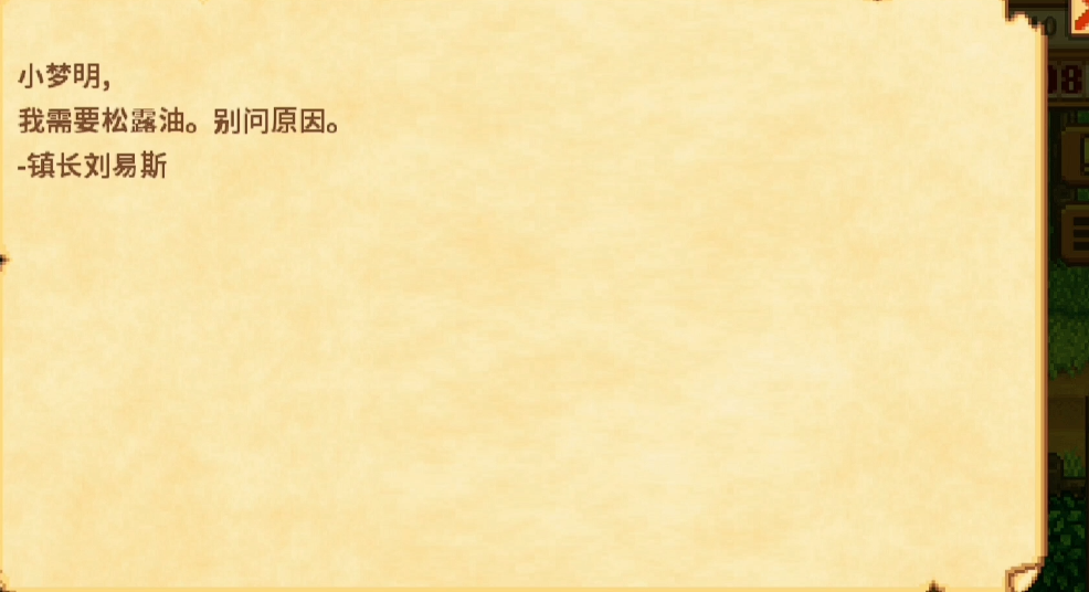 镇长的需求任务在第二年夏季第21天通过信箱接取,玩家会收到刘易斯的来信要求一瓶松露油,完成此任务需要将松露放入产油机等待约6小时生产出松露油,然后直接赠送给镇长即可,成功后玩家能获得500金币奖励。这个任务强调资源管理,松露油可通过农场动物如猪掉落松露后加工获得,玩家需提前规划农场生产以确保任务顺利完成,避免错过时间窗口。搜索详细说明了任务流程和奖励机制。