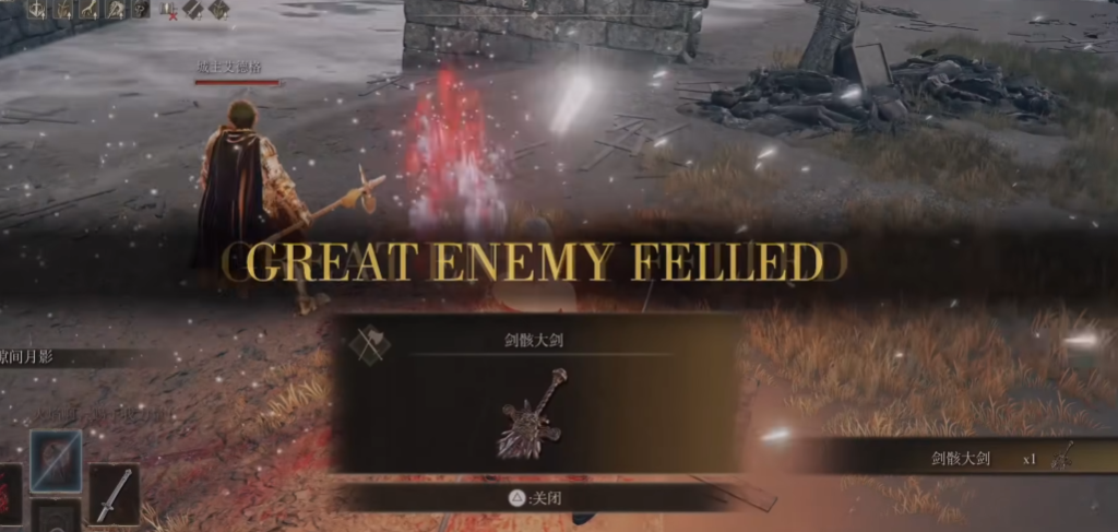 如果想探索摩恩城的更多内容,可以继续往城堡后方走。从城墙的缺口跳下去,会看到一个赐福点,附近还有梯子可以往下爬。这里能捡到一些有用的道具,比如火把和失色锻造石。再往前走会遇到BOSS狮子混种,击败它能拿到传说武器剑骸大剑。不过打之前记得召唤城主帮忙,这样会轻松很多。