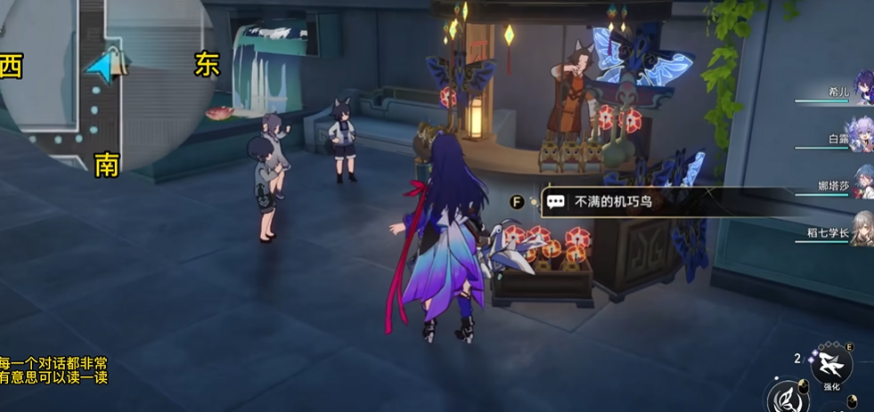 接下来需要依次寻找其余六只机巧鸟。在星槎海中枢东部角落可以找到充满怨气的机巧鸟,首次对话后需跟随指引前往指定位置再次交互,完成后解锁成就机巧鸟七故障·嫉妒。随后返回星槎海中枢中部商店附近,与不满的机巧鸟对话,通过逻辑选择测试后获得成就机巧鸟七故障·暴食。