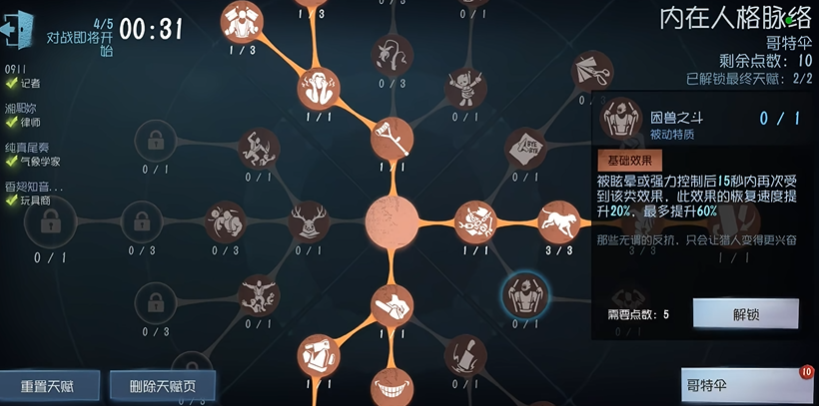 天赋加点方面,张狂是核心选择,能加速技能解锁并增强隔空抛触手的能力。追猎弥补黄衣之主前期移速不足的缺陷,夜枭则通过减少校准区域提高触手触发概率。封窗天赋可限制求生者在无敌点的周旋,而挽留天赋搭配传送特质能在后期实现翻盘。闪现作为辅助技能可提升追击效率,尤其在复杂地形中能快速拉近距离。