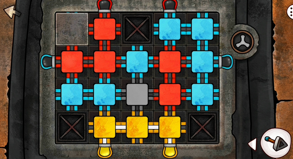 工厂左侧大门的机关是个九宫格棋盘,需要把每个小格子里的红点亮起来才能开门。每个九宫格只能往两个方向延伸,而且选定了方向就不能中途改变。建议从角落开始,先把边角的格子点亮,再慢慢往中间推进,注意别把路堵死。记住红灯填满整个棋盘就成功啦!
