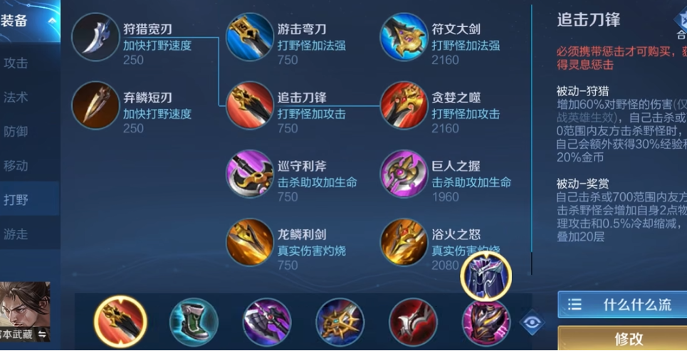 宫本的出装核心思路是利用他技能后强化普攻的机制,通过装备来提升物理穿透、冷却缩减和一定的生存能力,让他在战场上能打能抗,更好地切入敌方后排并发挥作用。出门通常会选择打野刀,如果你想用宫本打野的话。中期的核心装备组合一般是暗影战斧加上冰痕之握,这个搭配非常经典。暗影战斧提供了宫本急需的攻击力、冷却缩减和物理穿透,属性非常全面。而冰痕之握除了提供防御属性和冷却缩减,其被动造成的减速效果能很好地帮助宫本黏住敌人,弥补他缺乏硬控的短板。之后可以补上反伤刺甲或者魔女斗篷来应对敌方的物理或法术伤害。