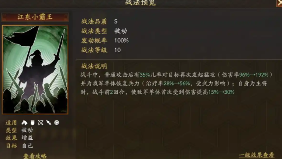 孙策是一名以稳定输出为核心的武将,他的自带战法和属性成长偏向于暴力伤害,能持续对敌军施加压力。孙策适合携带像强攻和弯弓饮羽这样的战法,强攻可以提升攻击频率,弯弓饮羽则能增强暴击效果,这使得孙策在对抗赵云时,有机会通过高额兵刃伤害快速削减赵云的兵力,从而在战斗中占据主动位置。