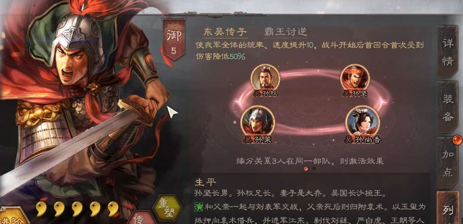 孙策需要避免携带控制类战法,因为赵云的洞察状态会使其无效化。相反,应专注于提升自身的生存和输出能力,例如通过加点全武来强化伤害,或选择兵书中的增伤词条,如攻其不备,这能进一步放大对高兵力目标的伤害效果,从而在遭遇赵云时提高胜算。孙策的军师技和属性成长能帮助他在对抗中占据先手,例如高速度属性让孙策能抢先行动,这在对战赵云时尤为关键,可以避免被赵云先手压制。