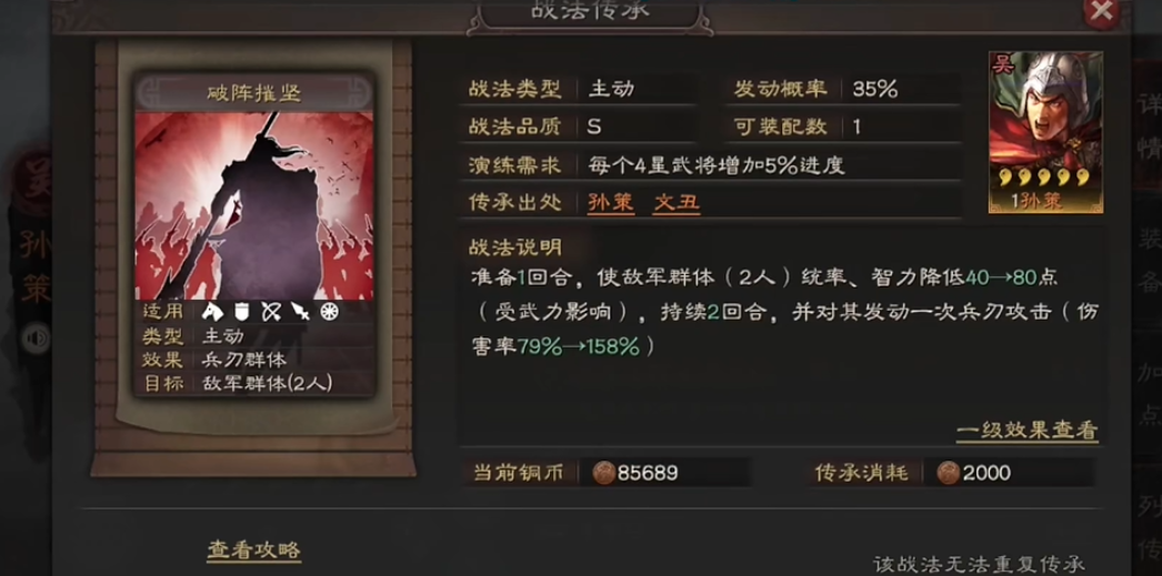 等到赵云觉醒,或者你手里有了其他武将,开始组建队伍正经打架了,赵云的战法就可以往更暴力的方向调整。这时候,输出最大化成为首要目标。因为他自带洞察,不会被技穷、震慑这些效果打断施法,所以特别适合带那些需要准备一回合、但伤害爆炸的主动战法。最顶尖的选择是所向披靡和破阵摧坚。所向披靡能对敌军全体造成高额兵刃伤害,是游戏里顶级的群体输出战法之一。破阵摧坚则更讲究战术性,可以先降低敌方的统率和智力,再打出伤害,等于是给自己和队友都创造了更好的输出环境。这两个战法组合在一起,赵云的输出能力会变得非常恐怖。横扫千军也是一个非常好的备选,它伤害不错,并且如果打到被缴械或计穷的敌人,还有机会附加震慑,能和很多队伍形成配合。