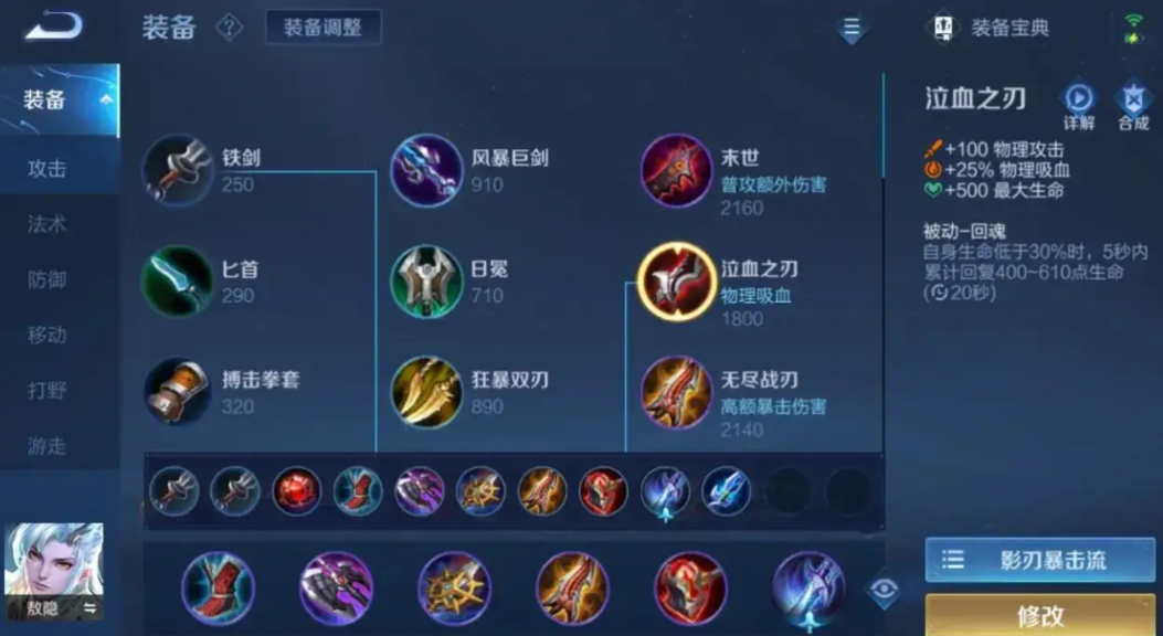 比如刺客经常来切后排,那就得考虑半肉输出流了。这种玩法会把影刃换成贤者的庇护或暴烈之甲,比如出急速战靴、闪电匕首、无尽战刃、泣血之刃、破晓和贤者的庇护。这套装能提高防御力,让敖隐不至于在团战中被秒杀,还能保持一定的输出。暴烈之甲在受到攻击时还能加点移速和伤害,非常适合在逆风局或者对面阵容压制力强的环境下使用。它能在关键时刻提供额外的生存机会,比如复活甲效果,让你有第二次战斗的可能,不至于一死就崩盘。这样出装后,敖隐的移速和续航能力都会增强,生命恢复效果也能延长存活时间。