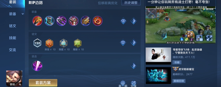 当对面物理伤害特别高,控制又少的时候,你可以把抵抗之靴换成影忍之足。如果局势顺风,你想打得更凶、压制力更强,可以在中后期补上宗师之力,它的强化普攻效果能让曹操的爆发更高;甚至可以考虑出无尽战刃,进一步提升伤害。相反,如果是逆风局,你的首要任务是活下去并能为队友承担伤害,那么就应该更早地做出防御装备,比如不祥征兆和魔女斗篷,血魔之怒的护盾在绝境时也很好用,先保证自己不被秒掉,才能有机会利用大招回血反打。装备的小件合成顺序也有讲究,前期先出陨星和速击之枪这样的小件,能让你对线期过渡得更舒服。