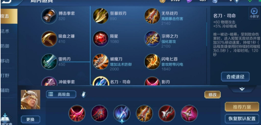 做完无尽战刃后,局势进入中期,这时候泣血之刃提供的物理吸血至关重要,它能极大增强你的线上续航和团战中的存活能力,让你可以持续作战而不必频繁回家。第五件装备选择破晓,这是射手打坦克的神器,它的物理穿透属性能有效应对敌方前排逐渐成型的护甲。最后一件装备则根据战场情况灵活选择:逐日之弓的主动技能可以增加射程和移速,让你在更安全的位置输出;如果生存压力极大,则换成贤者的庇护或名刀·司命来保命。