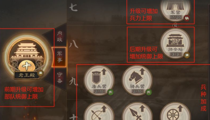 兵力保证的基础,在于高效的征兵体系。游戏的主城和分城内都有专门的兵营,这是你补充兵力的主要来源。你需要优先将兵营和相关军事建筑的等级提升上去,因为建筑的等级直接决定了单次征兵的速度和单次征兵的上限。征兵需要消耗大量的资源和铜币,特别是粮食和铁矿,因此在发展内政时,资源的均衡产出至关重要。切记不要停止征兵,保持征兵队列始终在运转,让你的兵力形成持续稳定的增长。除了常规征兵,你还可以通过建造并升级营帐来加快特定区域的征兵速度,这对于前线作战和快速补充战损非常关键。