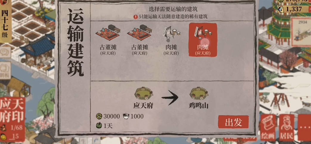 除了自主生产,玩家还可以通过游戏内的NPC和商人兑换肉类相关物品。严大人是游戏中常见的访客,他每日会出现在玩家城市中,玩家可以与他进行物品交换,获取肉摊等建筑。为了提高获得肉摊的几率,玩家可以将严大人的兑换过滤设置为士类别。盐商系统也提供兑换机会,当盐商达到三级时,每轮兑换中固定会包含至少一种小摊,如肉摊,供玩家选择。这些兑换方式为玩家提供了稳定的补充途径。