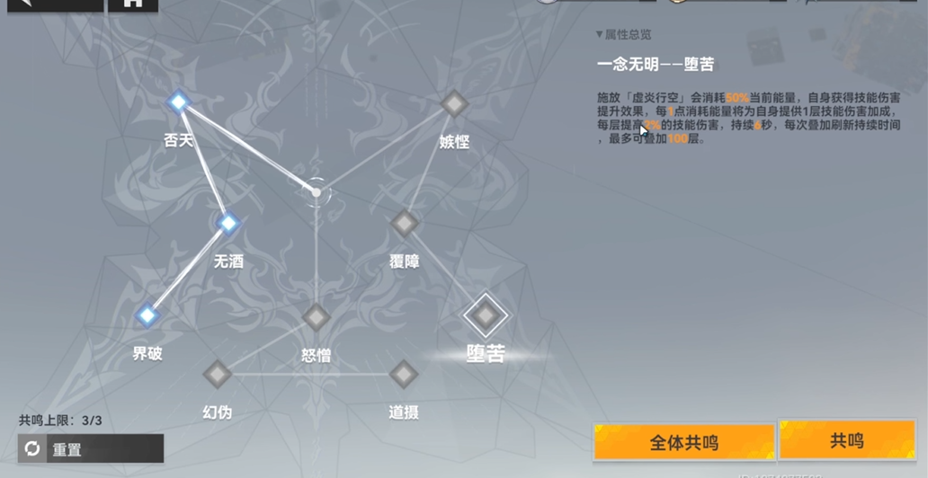 而追求极限伤害的玩家往往会选择一念无明神格方向,这条路线需要启用嫉悭、覆障和堕苦。它的核心机制围绕着能量管理展开,通过缚火状态下的普攻和技能命中来回复能量,并将能量转化为极高的技能伤害加成,理论上限很高。但相应的,这个选择对玩家的能量控制和战斗中的即时反应能力要求都比较苛刻,容错率较低,适合那些追求挑战和熟练掌握角色的玩家。