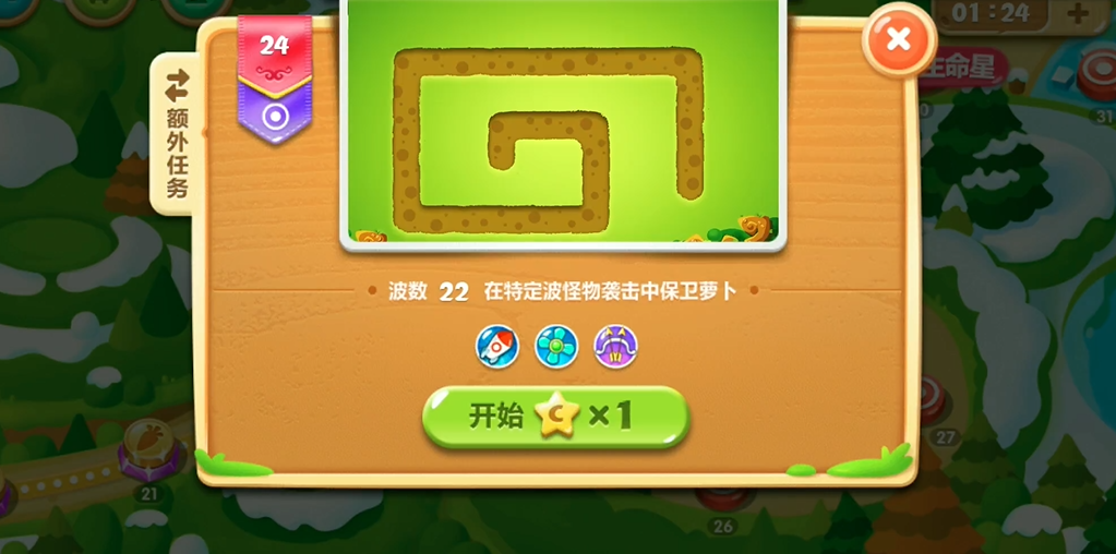 第24关游戏初始,应立刻在怪物出口的附近位置建造一个减速风扇塔,并将其升至满级。这个风扇塔的首要作用是抵御前几波怪物,同时开始累积使用减速风扇塔消灭30个怪物的额外任务计数。你的初始金币和注意力应集中在攻击地图上指定的第一个道具,例如一个瓶子或甲壳虫,打掉后会获得隐藏的瓶子炮塔。获得瓶子炮塔后,应迅速将其升级,此时应双线操作:用减速风扇抵挡怪物,用升级后的瓶子炮集中火力清理左侧或上方的道具,为后续任务腾出空间和资源。