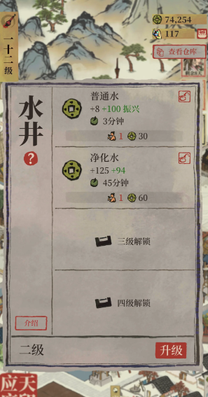 点击已建成的水井建筑,便可以开启其产出铜钱的功能。为了提高水井的产出效率,对其进行升级是常见操作,当水井被升级至第五级时,其单次产出的所需时间会缩减一半,从而能够在相同时间内进行更多次的生产循环,显著提升铜钱的获取速度。
