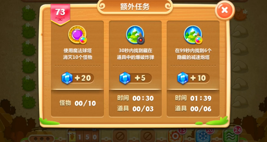 完成额外任务是获取完美评价的核心。本关要求使用魔法球塔消灭10个怪物,这需要在适当的路径位置建造至少一个魔法球塔并确保其能覆盖到足够的敌怪。另一个挑战是在30秒内找到藏在道具中的爆破炸弹,这要求玩家开局就必须锁定可能隐藏炸弹的道具区域并优先攻击。在99秒内找出6个隐藏的减速炮塔也需要有规划地快速清理特定道具。