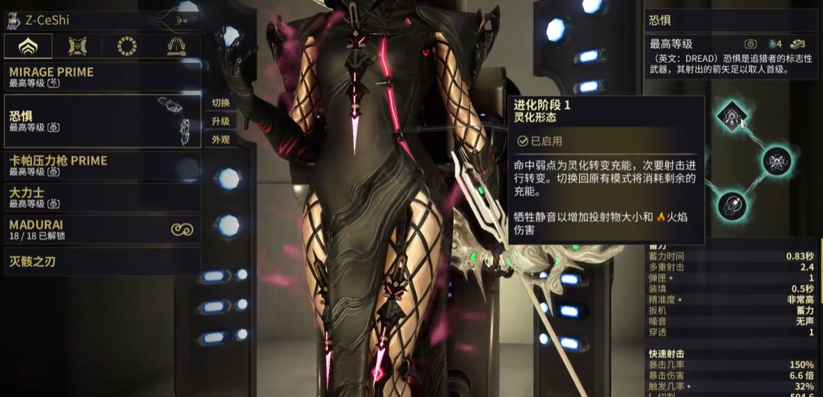 恐惧作为 stalker 专属掉落武器,凭借50%的基础暴击率位居弓箭类榜首。其射击弹道平直,蓄力时间适中,适合中远距离狙击高价值目标。该武器对 Mod 配置要求较高,需搭配暴击伤害与基伤类 Mod 才能完全发挥潜力。与其他弓箭相比,恐惧的获取存在随机性,需要击败特定敌人并有一定运气成分。
