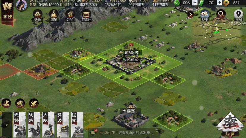 分城是提升资源产量、税收和声望上限的重要设施,但建造分城需要满足特定条件并消耗大量资源。玩家需确保名望值达到6000这是建造分城的基础门槛。必须占领一块3×3的九宫格资源地,且地块内不能存在要塞或军营等建筑。满足条件后,需消耗25000木材、25000铁矿、35000石料、20000粮草以及5个政令才能完成建造。分城的选址尤为重要,建议优先选择6级及以上资源地作为中心地块,以便解锁特殊建筑功能。