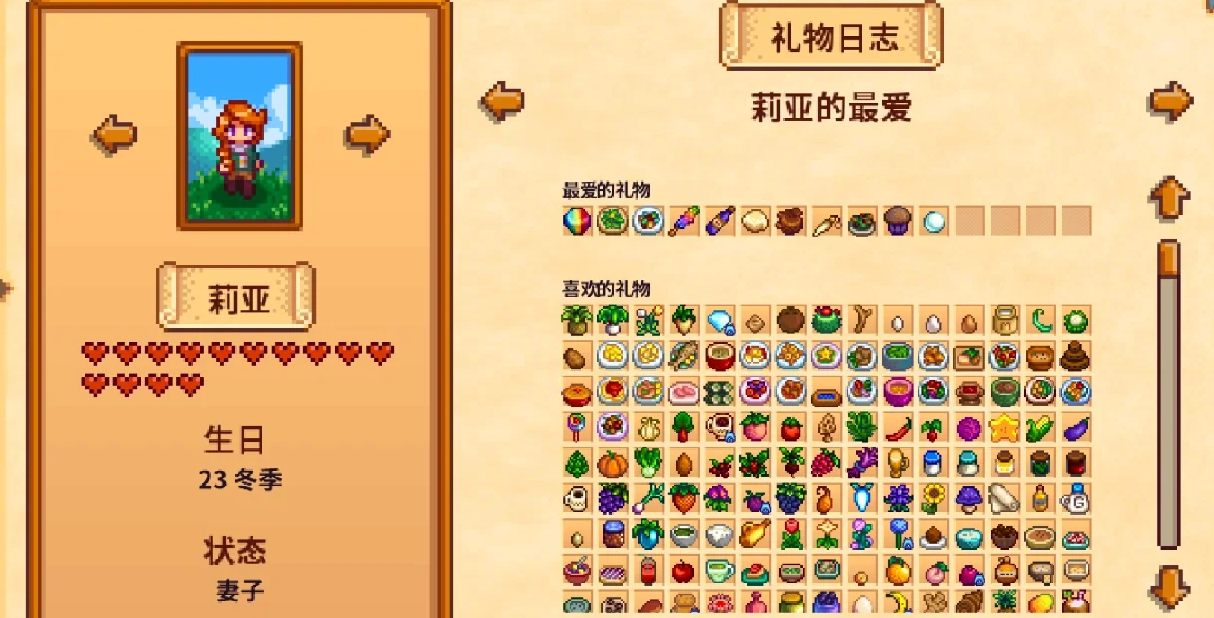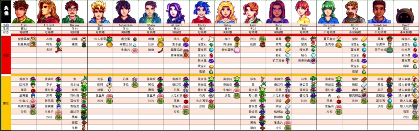 游戏里的礼物分为最爱、喜欢、普通、不喜欢和讨厌五个等级。最爱和喜欢的礼物能加最多好感,普通礼物效果一般,而不喜欢和讨厌的礼物则会减好感。比如镇长刘易斯最爱的礼物是炸鱼和李子酒,但非常讨厌榴莲,如果不小心送了榴莲,他会直接黑脸。其他村民也一样,像艾米丽最爱紫水晶和海蓝宝石,而文森特则喜欢披萨和椰子,但讨厌所有蛋类和工艺品。