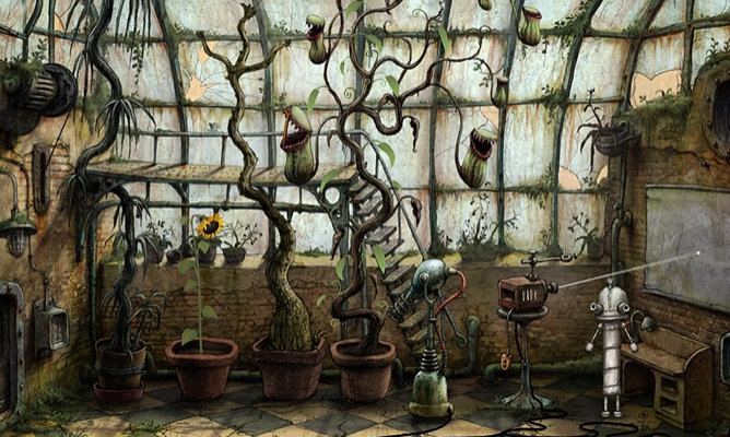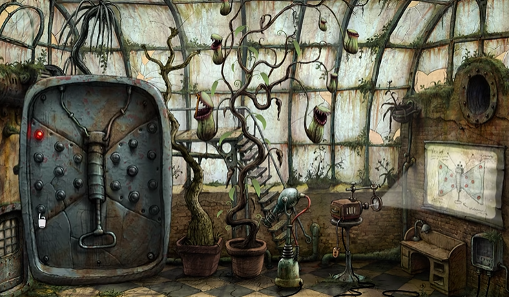 温室里还有一盆猪笼草,同样用加热器催熟它,等它长大后会吸引一只蝴蝶停在窗边。这时候记得用放大镜仔细观察蝴蝶翅膀的花纹,这个图案后面会用到。然后去房间左侧找到一个开关,按照蝴蝶花纹点亮油灯,这时候隐藏的榨油机就会出现了。