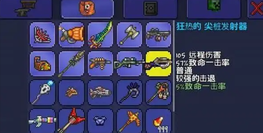 尖桩发射器对吸血鬼有特殊的伤害加成,能造成惊人的10倍伤害。这个加成是在计算完所有装备和增益效果后才乘以10倍的,所以实际打出来的数字会非常夸张。想要补充弹药的话也很方便,只要背包里有尖桩发射器,就能找军火商或者巫医购买尖桩,每个只要15铜币。