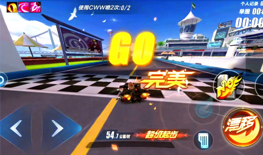 漂移技术在起步控车中起到关键作用。超级起步是常见的高级技巧,通过在倒计时结束时快速衔接小喷与点漂,使车辆在起步瞬间获得更高的初速度。具体操作为:倒计时1消失时按下加速键触发小喷,随后立即按住方向键与漂移键完成短促漂移,最后反向拉回车头。这一过程中,漂移幅度需控制在45度以内,避免过度转向导致速度损失或车身失控。