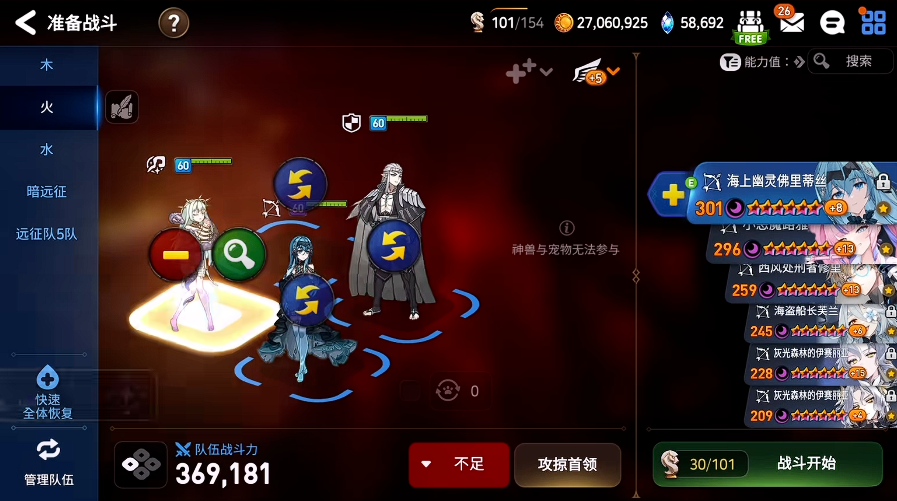 火远征作为游戏中难度较高的副本,由于关卡特性限制,很多属性角色无法使用,推荐使用支配者莉莉亚斯、塔拉诺尔禁卫队员、指挥官萝里娜和露娜的组合,这套阵容能稳定打出20W以上的分数,如果练度足够还能冲击更高分。