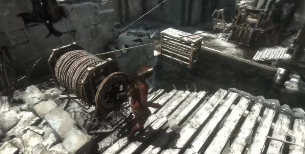 接下来咱们跳到右边高台上,这里能看到第二层的转轮。再用绳箭把远处和近处的转轮连起来,然后回到一层中间的转轮重新调整。这次反过来,让左边平台升到最高,右边降低。固定好后,迅速跳到左边高台,再抓住绳索荡回二层。这一连串操作要一气呵成,因为平台只能维持30秒左右,手慢的话就得重来。