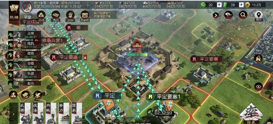 首先最基础的途径就是扫荡野地,这在新手期过后是主要的经验来源。玩家做完新手任务,把周围能占的地盘都占领剩下的就是反复去扫荡已经占领的土地。刚开始可以优先扫荡距离近的二级野地,两分钟就能一个来回,效率不错。主力部队的等级和兵力提升,比如把曹操、孙坚这样的组合升到8级左右,有了大约1600兵力后,就可以去挑战三级地了。野地等级越高,打完获得的经验奖励也越丰厚,所以要在保证能打过的前提下,尽可能去刷更高级的地。