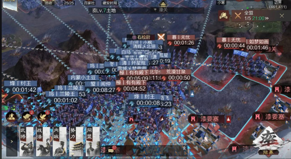 到了游戏中后期,想要更高效地获取经验,刷城皮是一个不错的选择。所谓城皮,就是城池周边的守军。不管在哪个赛季,刷城皮都是效果比较好的练级方式。但这需要根据你自身的武将阵容和战法经验量力而行。如果你的队伍强度高,战法配置好且等级都满10级,那么就可以选择一些守军相对较弱、攻打起来战损低的城皮来反复刷。如果你的阵容和战法都还处于成长阶段,那么也可以退而求选择距离比较远的、同样低损的五级野地进行练级。在刷城皮或高级地时,注意利用好游戏里的扫荡功能,可以节省操作时间。