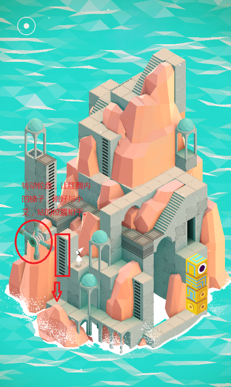 玩家首先会出现在一个小岛上,看到一朵红色的花,从楼梯走上去点击花,主角艾达会拾取它,拾取后沿着楼梯向下走,继续探索下方的结构,不往下走就看不到更多关卡,接着往右边的墙梯处向下移动。接下来玩家需要操作旋转阀门来改变楼梯的布局,向左转动阀门,左边会出现一个梯子,右边楼梯下降,从楼梯上去按动小方块开关,然后右边结构转动,再从楼梯走下去,反复转动阀门调整路径,帮助艾达移动到右侧区域,爬下梯子走到下方,再次转动阀门使楼梯升降。