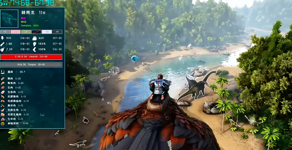知道了喂什么,接下来就是怎么让恐龙老老实实吃下去。通常的步骤是先把恐龙打晕,让它进入昏迷状态。这时候你走近它,按E键就能打开它的物品栏,然后把准备好的食物拖到它的背包里,它就会自己开始吃了。这个过程里你得时刻注意两个进度条:紫色的那个是昏迷条,如果它快见底了恐龙就会醒过来逃跑,那就前功尽弃了;金色的那个是驯服条,等它涨到100%就大功告成。为了不让紫色的条掉太快,你得给它强制喂食一些能维持昏迷的东西,首选是麻醉药,它效果最好,对驯化效率的影响也最小;退而求其次的选择是黑果子,也就是麻醉药的材料,但喂这个会降低驯化效率。千万别喂白果子,那东西是解麻的,会加快恐龙苏醒,直接导致失败。