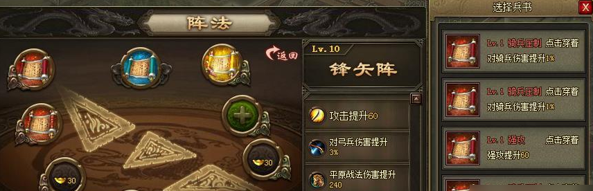 解锁了基础阵法槽位只是第一步,要让阵法能够变化,你还得深入研究兵书系统。变阵功能对兵书的等级和数量有严格要求。你需要准备一套完整的10级六韬兵书,需要3本攻击位的、2本防御位的和3本血量位的,总共8本。收集并把这些兵书提升到10级是个相当漫长的过程,因为制作一本高级兵书就需要消耗大量同类型的残卷和许多低级兵书作为材料。只有当你为某个阵法镶嵌了这样一套完整的顶级兵书后,这个阵法才算是具备了开启变阵的资格。