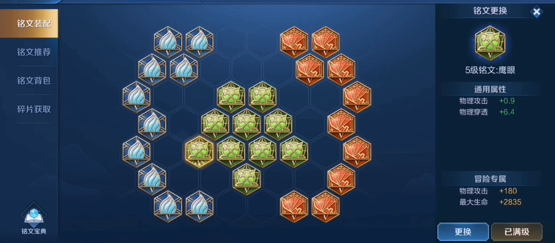 第四件出逐风,高额攻速与移速属性能完美转化为马超的伤害,强化戳枪的流畅度与输出能力,让肉装马超的伤害不会因坦度提升而大幅下滑。第五件选择不死鸟之眼,大幅提升法术防御与回复效果,配合马超捡枪回血的机制,残血状态下一枪可回复大量生命值,持续作战能力极强。最后一件出怒龙剑盾,提供双抗与高额生命值,被动还能提升回复量并附带额外伤害,进一步巩固坦度与续航,让马超在团战中既能扛伤又能稳定输出。铭文方面,狩猎提供移速与攻速,虚空增加生命值与冷却缩减,宿命提升生命值与物理防御,少量红月补充攻速,整体属性完美适配肉装马超的坦度、冷却与输出需求。