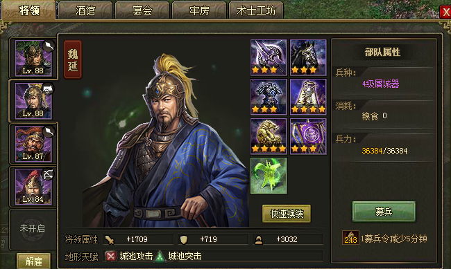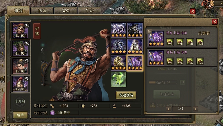 实战细节要把控好突进节奏,每座关键城至少留3个影子防止卡位,突进次数达标可额外争取操作空间,单挑时优先用魏延、典韦扛伤,马超、许褚补输出,残血武将绝不继续上阵,必须回满状态再进场;装备不足时,散装优先堆强攻、强防、血量词条,御宝选环首车橹、金鳞玄甲提升生存与战法抗性,晶石侧重攻防血属性,最大化团队续航与输出,避免因属性不够导致单挑失败、推进卡顿。