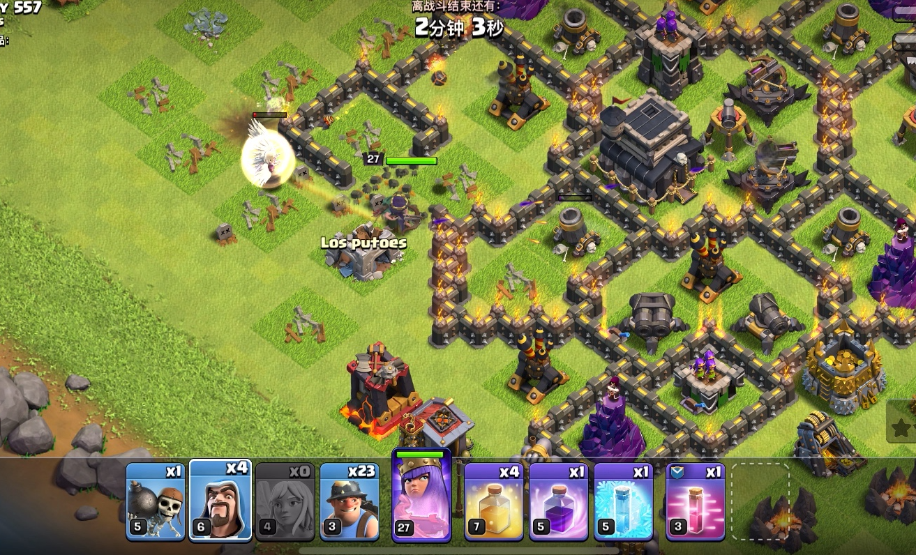 天女矿猪流为地面万金油阵容,适配多数常规阵型,核心配兵为4至6天使搭配弓箭女王,辅以12至15矿工、8至10野猪骑士,搭配2至3只龙宝清边、4至6个法师补伤,法术选择2狂暴、2治疗、1冰冻、1弹跳,攻城机器选战车或训练营。开局用龙宝与法师彻底清边,防止主力走偏,随后下女王与天使,稳定清理侧翼防御、击杀敌方援兵,优先拆除防空火箭、多头地狱塔与天鹰火炮,为后续部队扫清威胁,待天女推进至阵型半区,在进攻路线投放矿工与野猪,大守护者跟随提供光环与金身,防御密集区释放治疗与狂暴,冰冻控住单头地狱塔、投石炮等高伤建筑,野猪踩雷后矿工快速穿阵,双王与剩余兵种收尾,整体节奏稳、容错高,适合多数玩家熟练掌握。