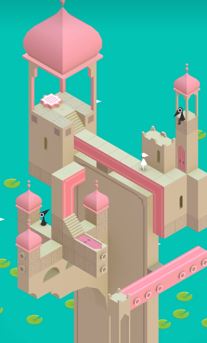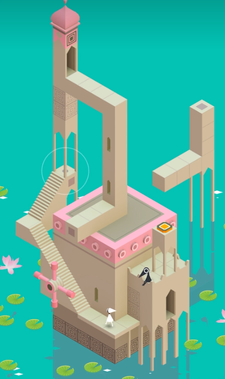 抵达上层区域后,会遇到带有乌鸦的粉色旋转平台,先转动平台调整角度,让艾达避开乌鸦,走到平台边缘的传送门前。进入传送门后会来到一个环形空间,与蓝色小人完成对话后,再次返回之前的水宫场景。此时需重新旋转底部的大型转盘,将水宫调整至初始场景的对称角度,让顶端的最终路径与终点平台连通。艾达沿拼接好的路径走到顶层,踩下最后一个黄色机关,水迷宫的核心建筑会升起,形成通往终点的完整道路,顺利完成关卡。