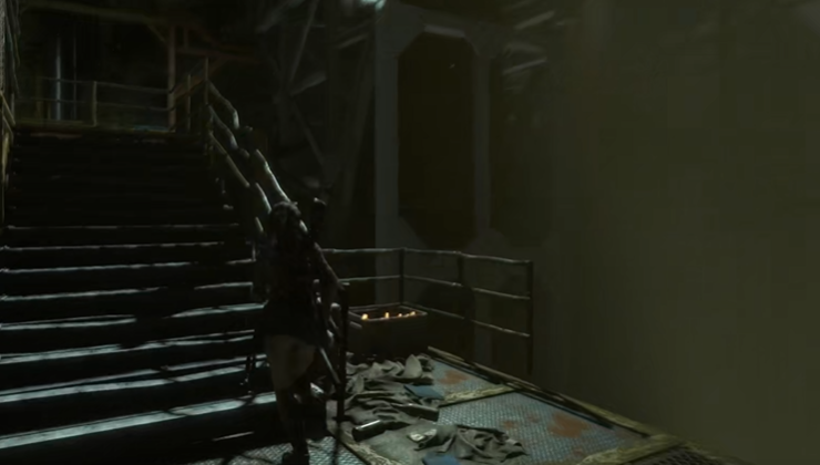进入主场景后是个巨大的洞腹,先走左侧通道找到营地挖掘坑道,然后跳到对岸开始解谜。这里的关键是利用轨道上的矿车挡住水流,先用燃烧瓶烧掉白布障碍。跳到悬吊的吊斗上,轨道上的两辆矿车会坠落,其中一辆会悬在水流下方挡住水流。这时候再烧掉水流下方的白布障碍,就能跳过去了。