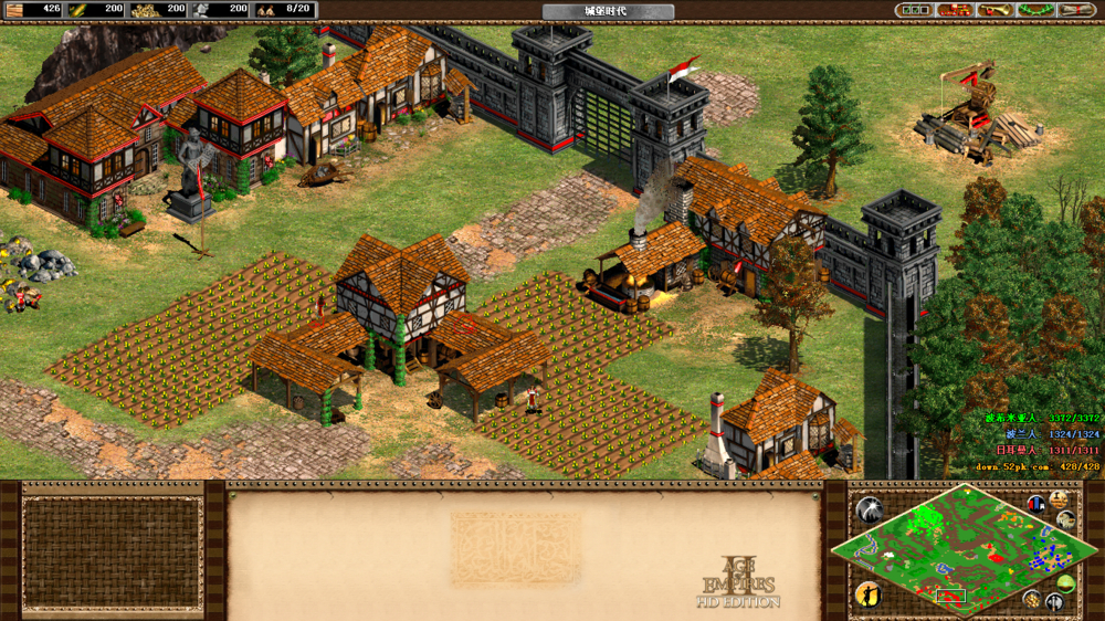 开局后,你需要立即将工作重心放在资源采集上,初期应集中采集食物和木材,确保村民的持续生产,为军事单位提供支撑。蒙古文明拥有打猎加速的特性,尽早清理地图上的鹿群和野猪能有效提升食物积累效率。黄金和石料的规划尤为重要,石头应优先用于建造城堡构建核心防御,黄金则主要用于训练蒙古突骑等特色兵种以及研发必要的科技。合理分配两个基地的资源采集优先级,上方基地可侧重木材和黄金,下方基地则要重点保障食物供应。